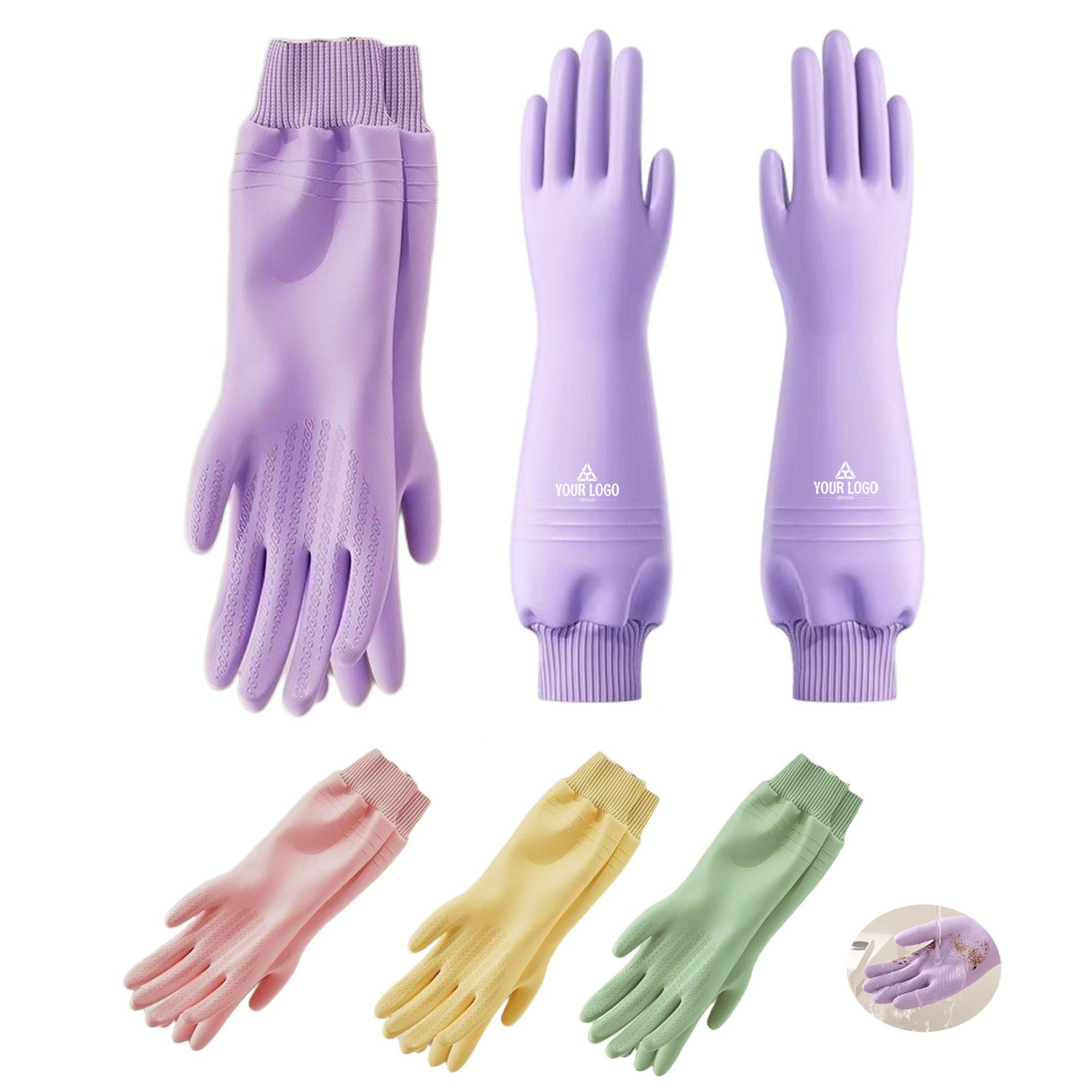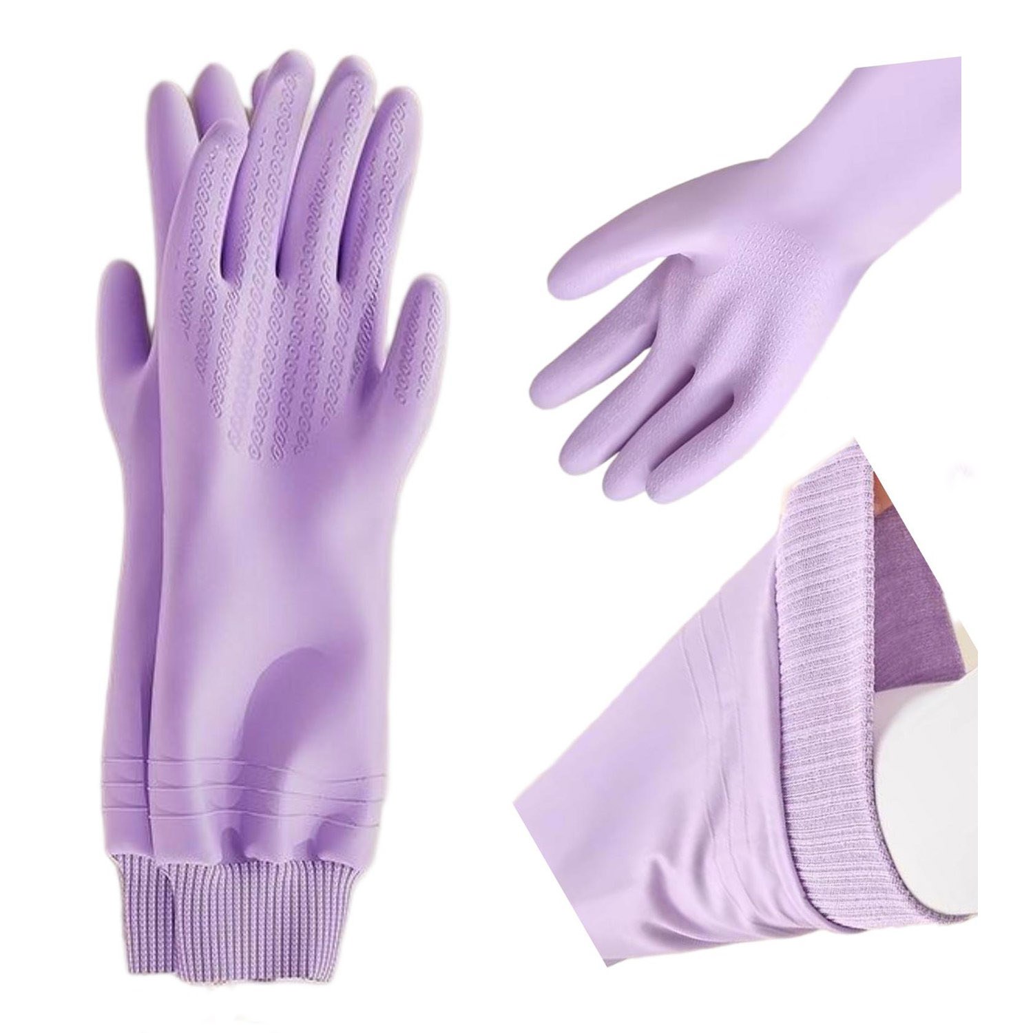 These winter rubber gloves are designed for cold-weather comfort and performance. Thickened with a soft fleece lining, they provide reliable warmth for hands during autumn and winter chores. The ribbed elastic cuff ensures a snug fit to lock out cold air and moisture. A textured diamond-patterned palm offers enhanced grip, making them ideal for washing cars, cleaning kitchens, or handling slippery items. Available in multiple colors such as lavender, pink, yellow, and green. Customization is available —perfect for personal, household, or promotional use.